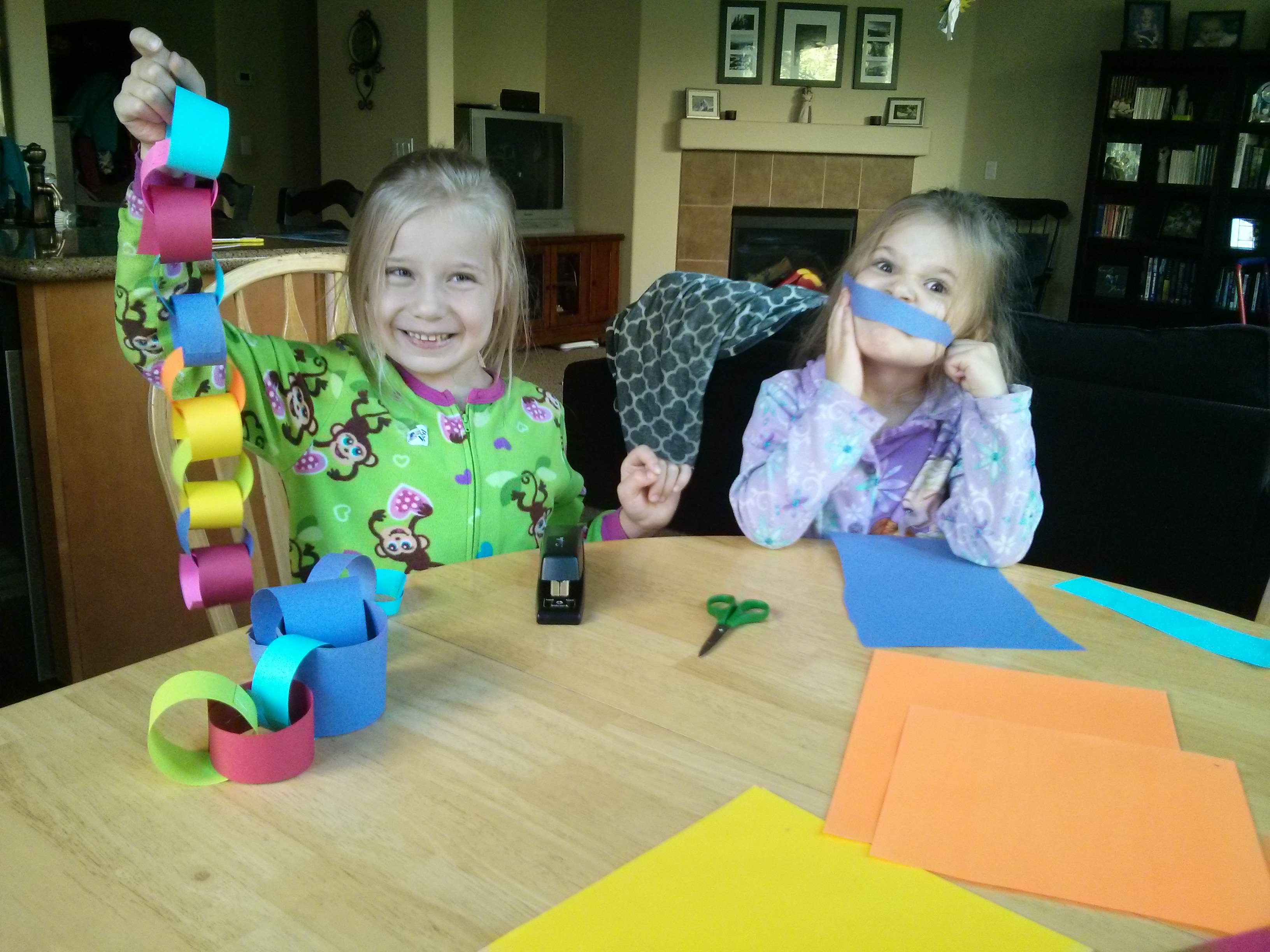 Making a paper chain for when Mommy comes home. 🙂