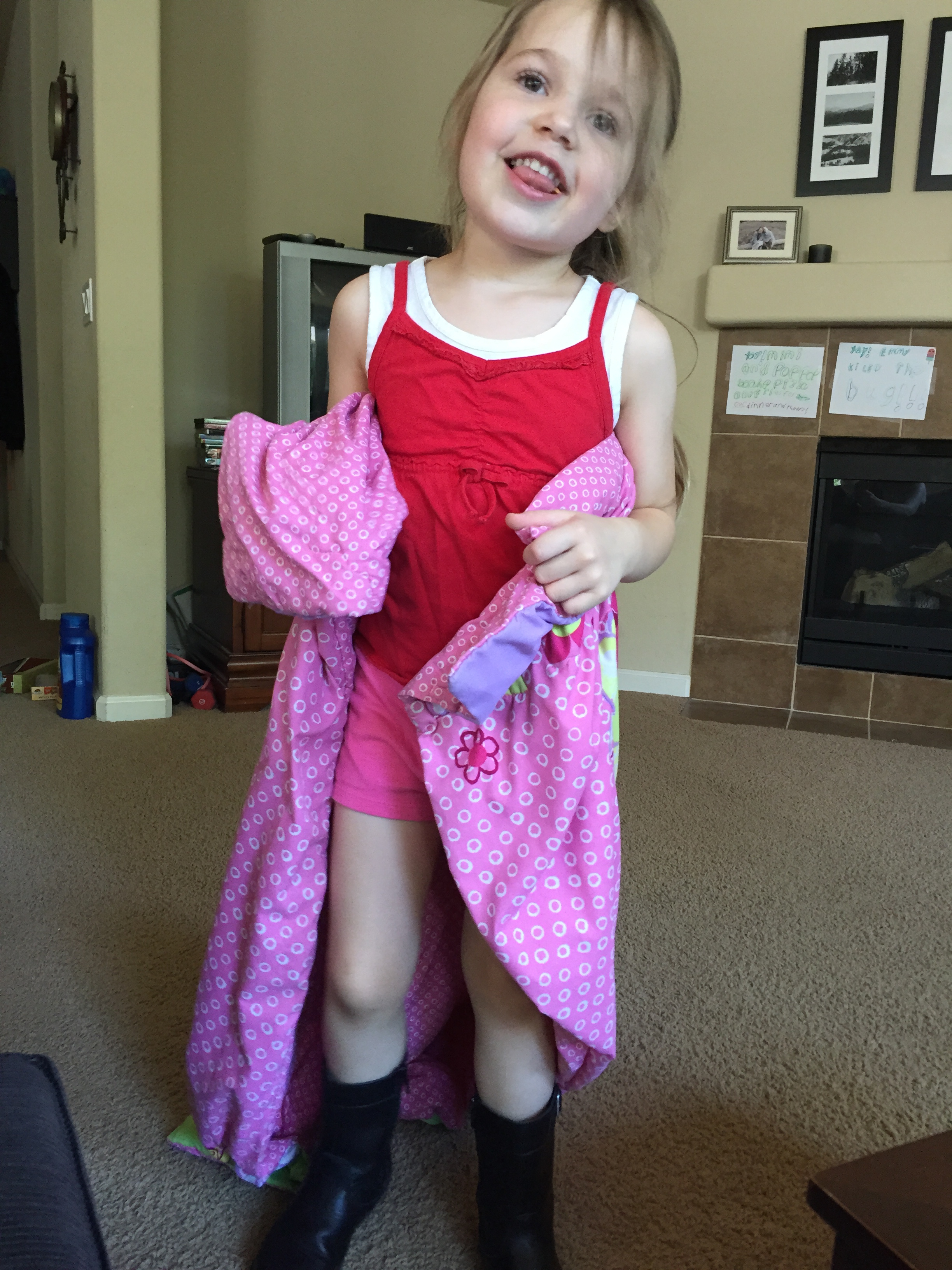 Pretending to be Elsa. Note the boots and the blanket for a cape. 🙂 Share this:EmailFacebookTwitterPinterest