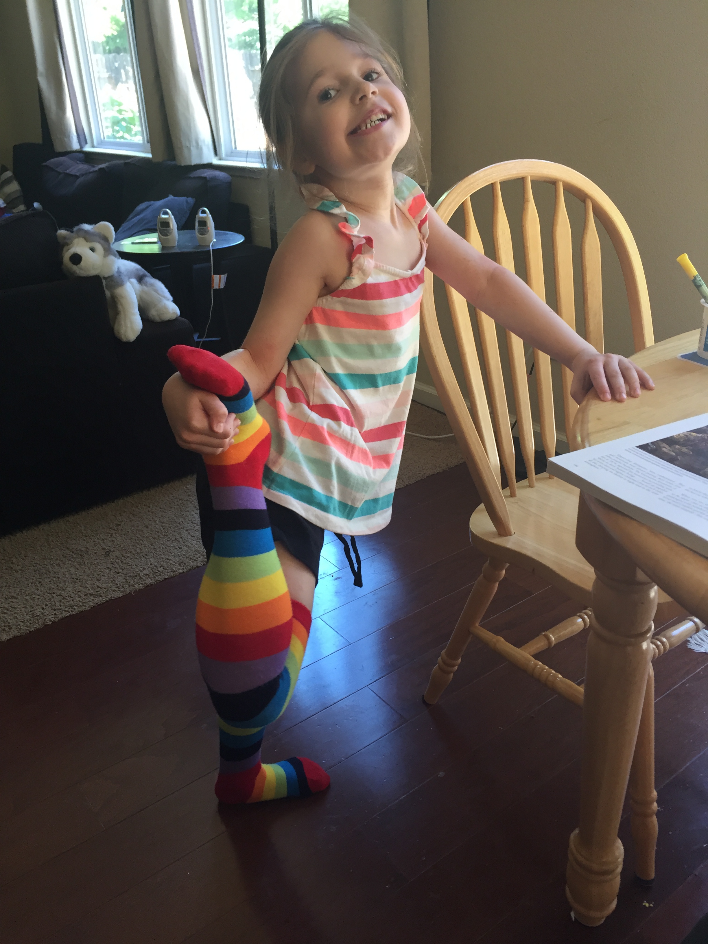 Showing off her new rainbow socks. 🙂 Both girls worked really hard and finished their books this year. Share this:EmailFacebookTwitterPinterest