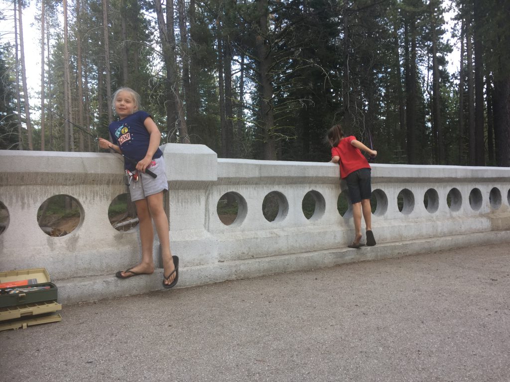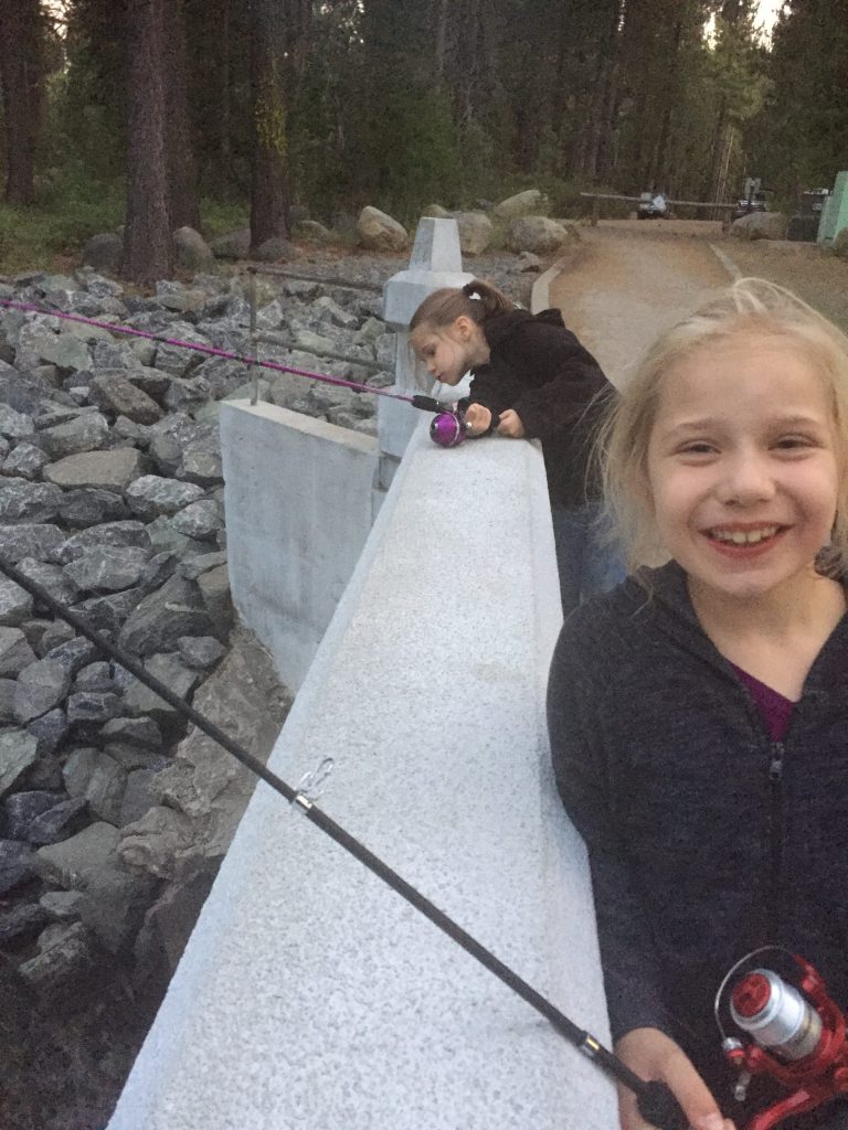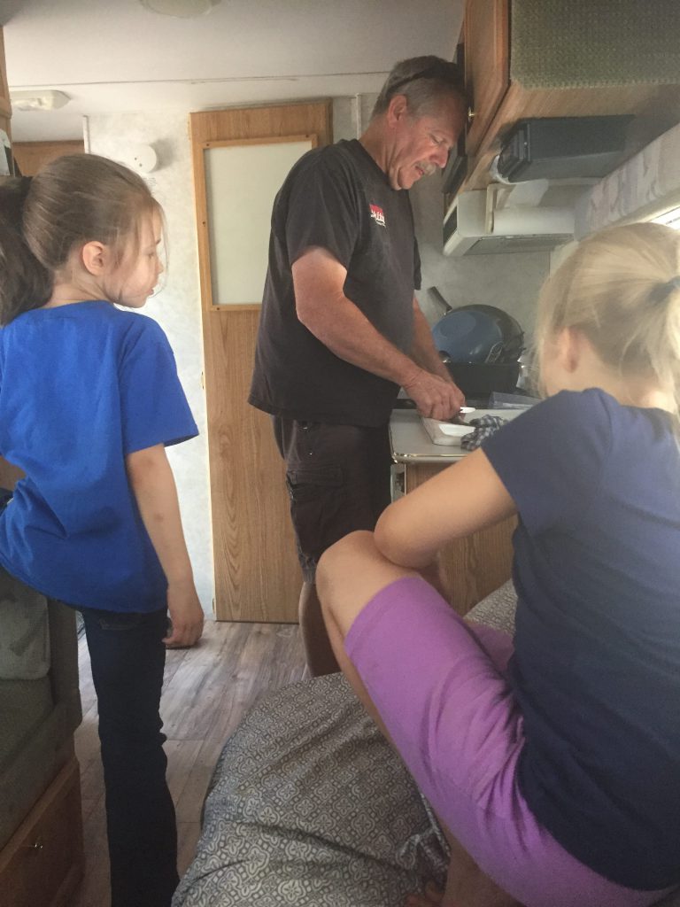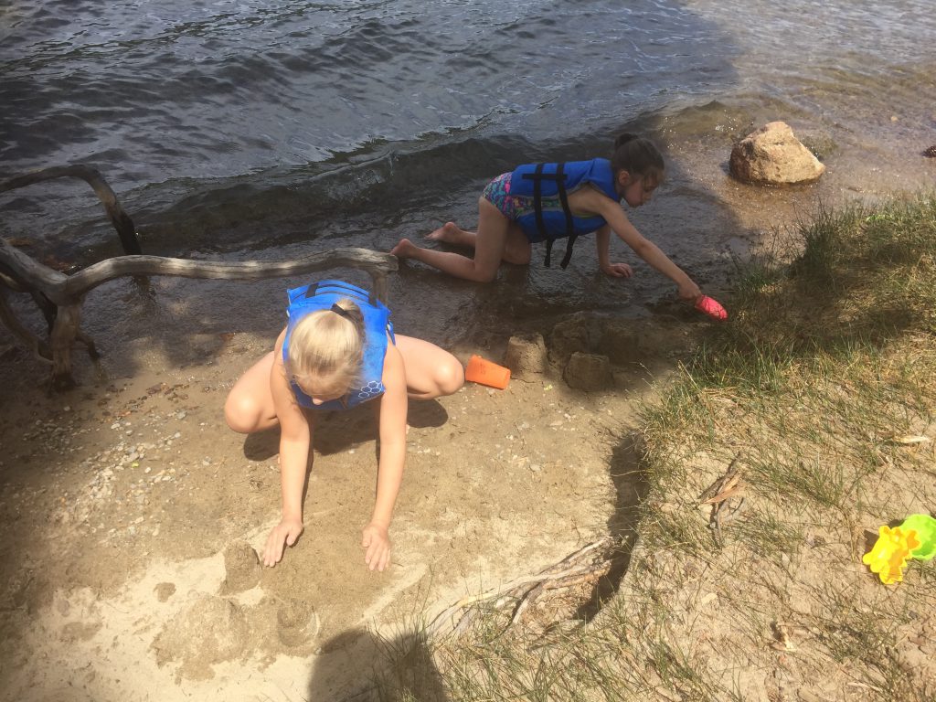 The trash truck driver, who empties the dumpsters at the campground, let both girls check out the truck and honk the horn. Emmy thought it was awesome!Learning how to clean fish. 🙂Just chilling and playing in the dirt. Building sand castles with Uncle Mike. 🙂More fishing. Petting a really big frog.
