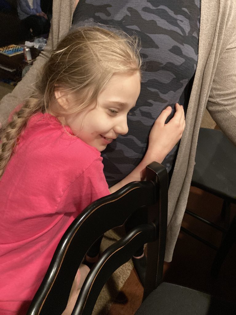 Hugging her cousin. 🙂